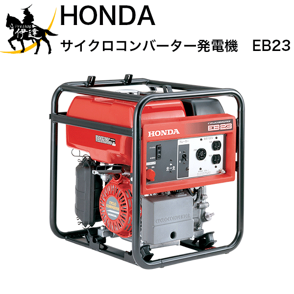| ※こちらの商品は代理店直送品となります※※ご購入時、発電機にはエンジンオイル、燃料は入っておりません。別途給油、補給してください※【特徴】●使いやすさ・従来のスタンダード発電機を圧倒的に上回る軽量コンパクトボディ・保管時の3段積みを可能にする段積みフックを標準装備●品質、信頼性・信頼のHondaエンジンを搭載。長年の実績に裏付けされた耐久性。・エンジンの焼き付きを防止するオイルアラートを搭載。●環境、燃費性能・世界の環境基準に適合するHonda4ストロークエンジン。【仕様】定格交流出力50/60Hz:100V-2.3kVA騒音レベル[dB(A)/Lwa]:97[3/4負荷]、98[定格負荷]タンク容量:9.2L全長:445mm全幅:402mm全高:496mm連続運転時間:5.8h質量:30kg使用燃料:自動車用無鉛ガソリン【注意】 屋内では絶対に使用しないでください。 屋外でも換気の悪い場所では絶対に使用しないでください。 発電機の使用中に出る排気ガスには有害な一酸化炭素が多く含まれており、一酸化炭素中毒を引き起こす恐れがあるため、大変危険です。